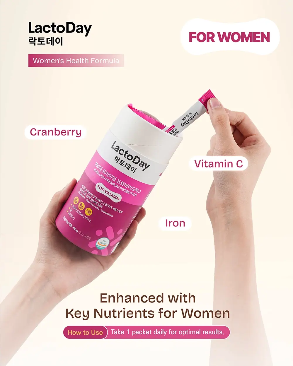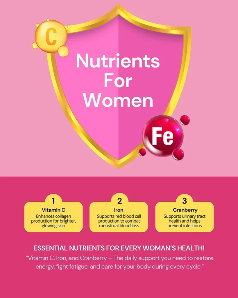 Probiotics formulated for women, this blend combines 10 Billion CFU Premium Probiotics with Prebiotics, Iron, Cranberry, and Vitamin C. It supports gut health, strengthens immunity, and addresses women’s unique needs — from intimate health to energy balance and skin vitality.