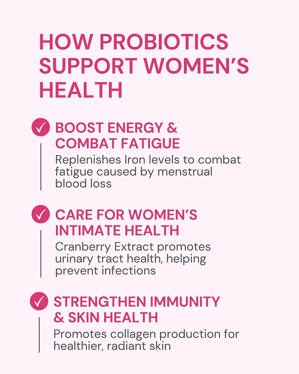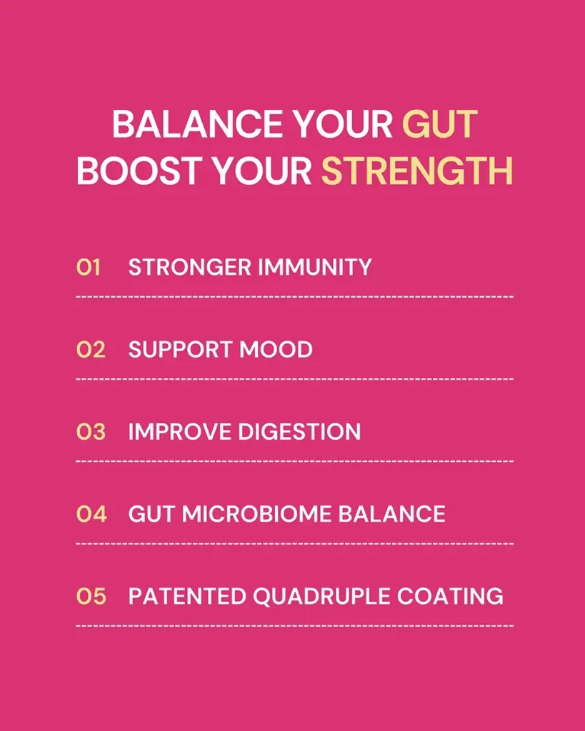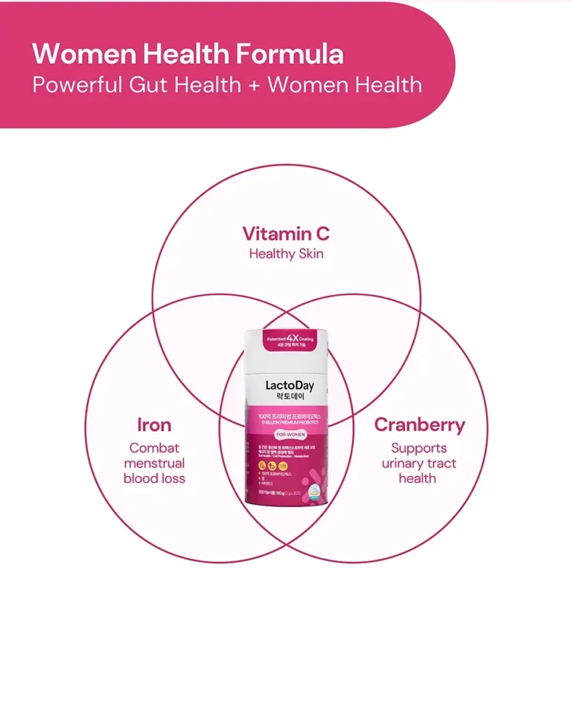Probiotics formula promotes digestion, supports UTI and vaginal health, restores iron with vitamin C, and boosts skin vitality naturally.