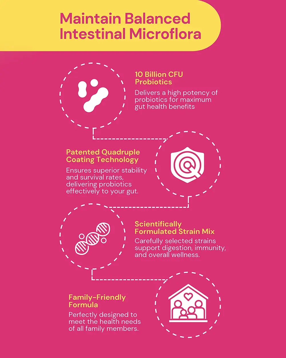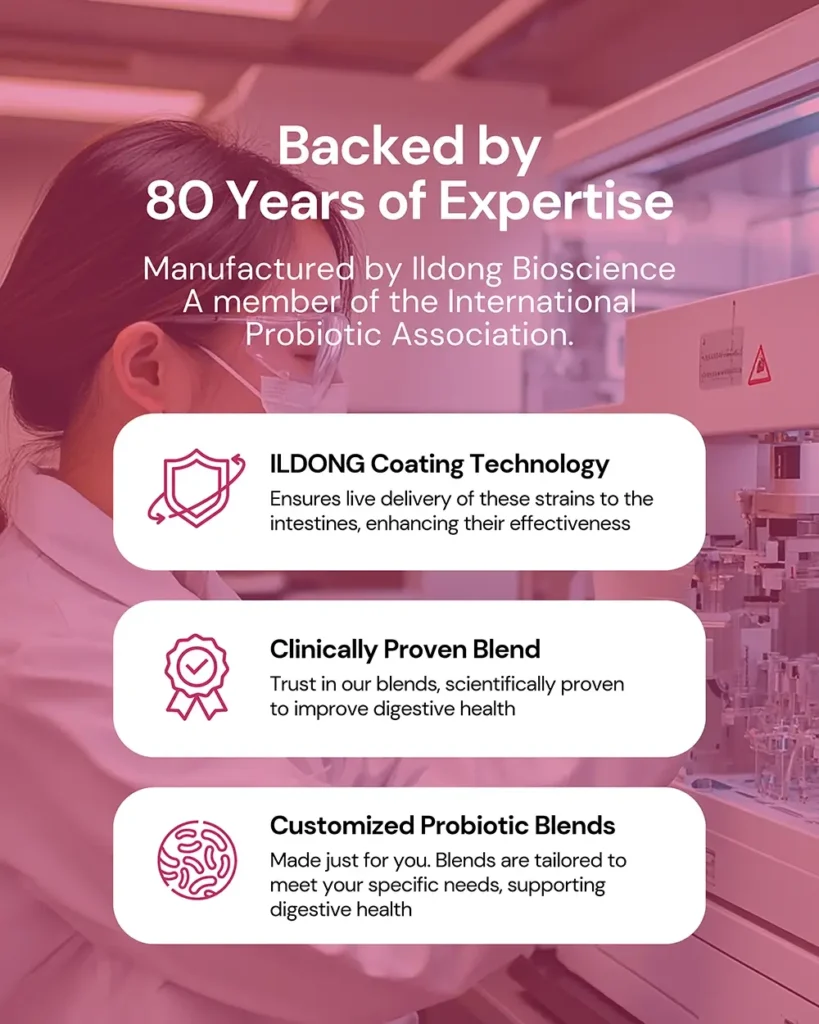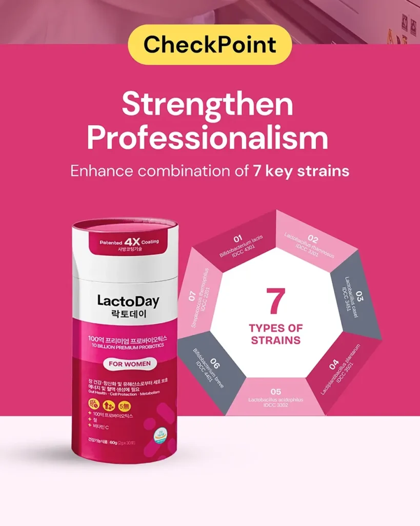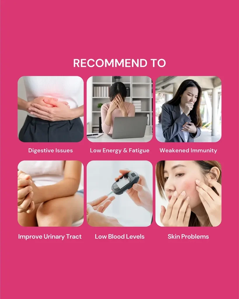 Probiotics formula promotes digestion, supports UTI and vaginal health, restores iron with vitamin C, and boosts skin vitality naturally.